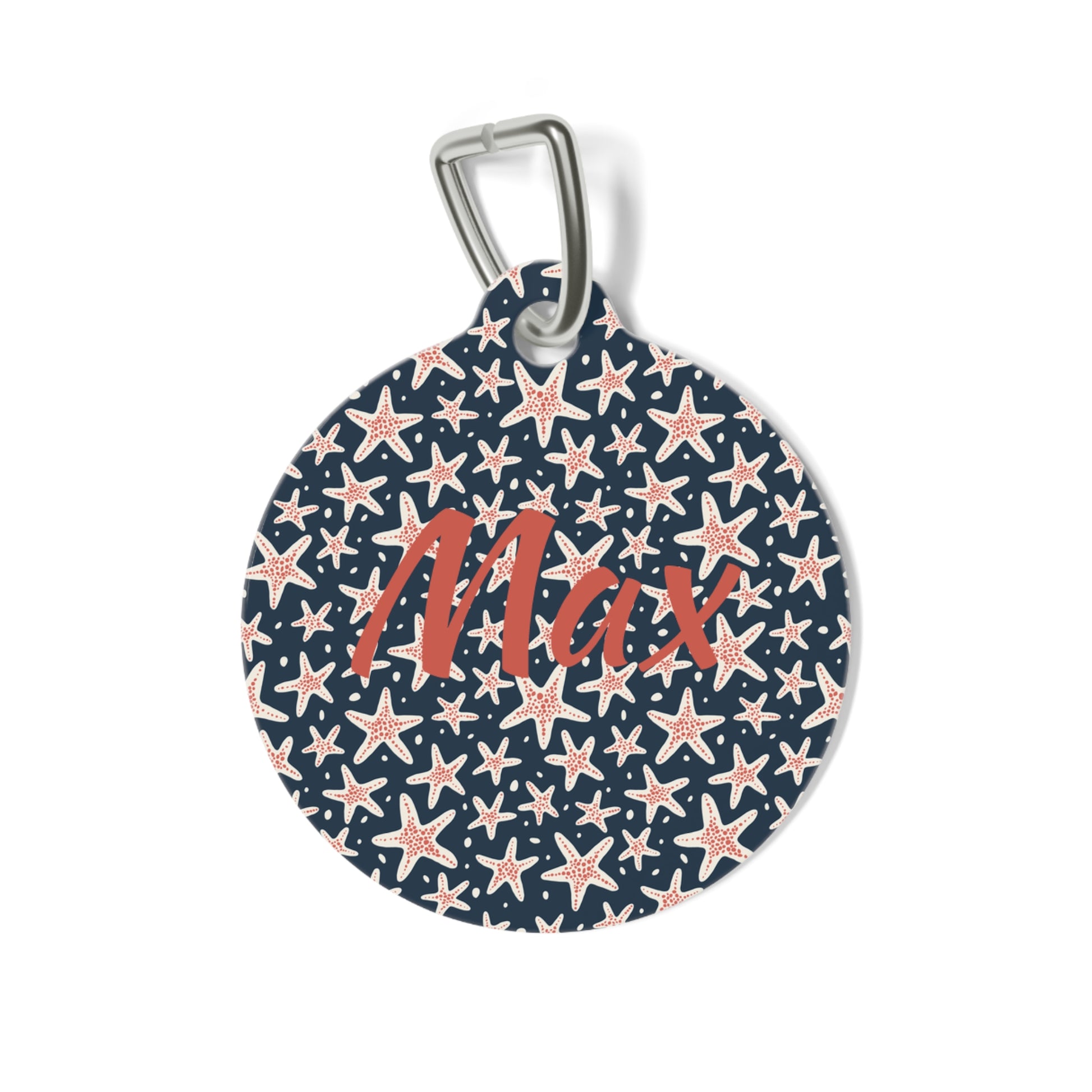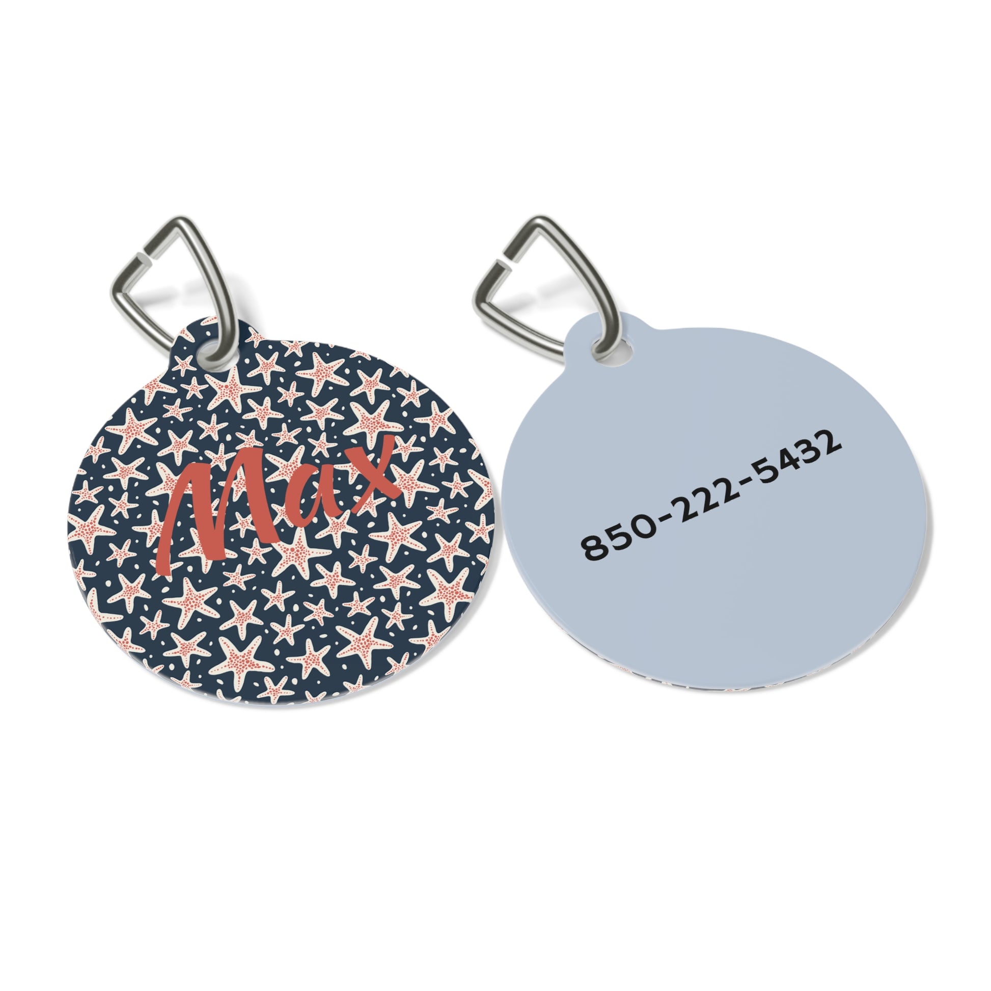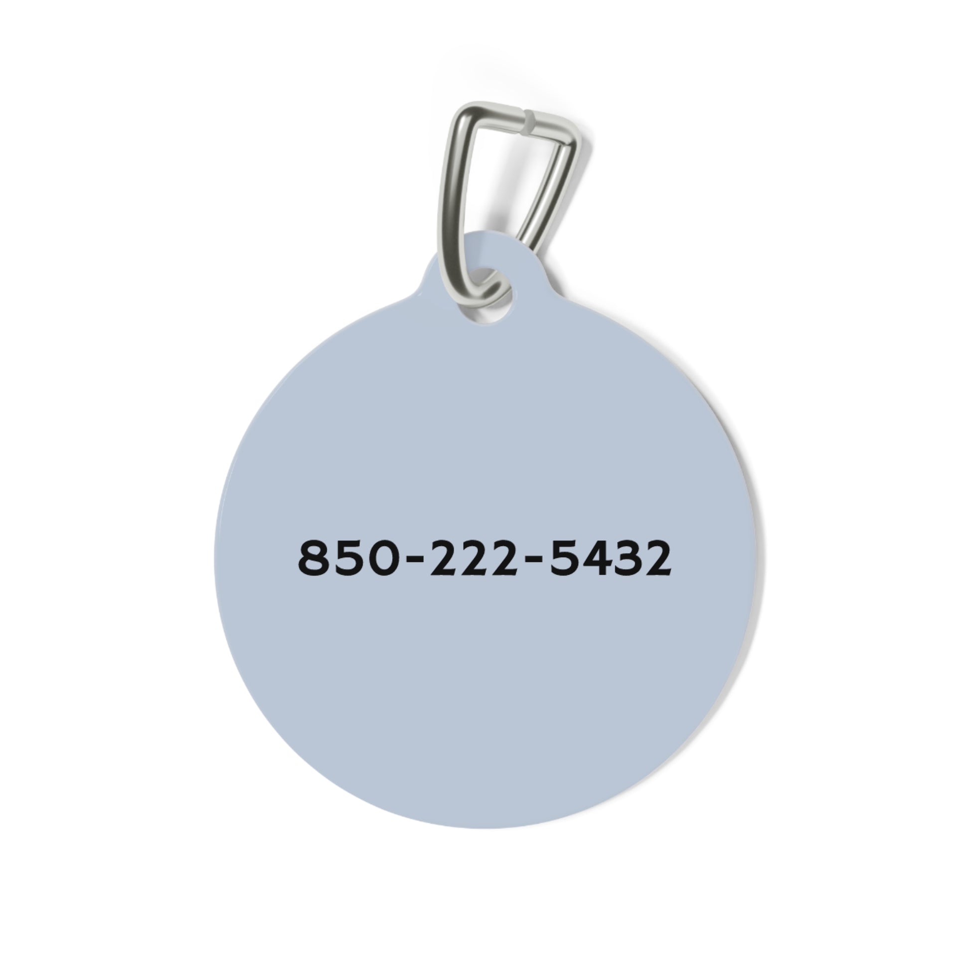Personalized pet tags provide a fresh way to spice up a furry friend's collar. The tag and clip are both made of metal. This increased durability comes in handy, as collar pieces can snag on brush, corners, etc. The base color is white, giving designs an even printing surface. Both sides are flattened.